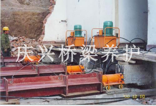 5、安裝好油壓千斤頂,同時(shí)計(jì)算好每條柱子的承重及需要頂升的高度。整體同步