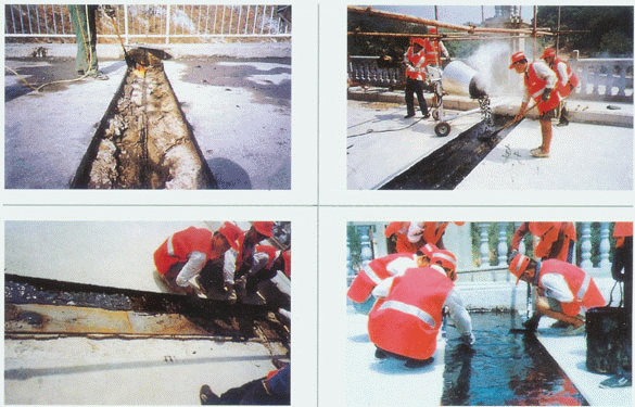 (5) 切縫:要求在切割伸縮縫之前必須對瀝青油面平整度進(jìn)行檢測,根據(jù)實(shí)際平整度情況考慮是否適當(dāng)擴(kuò)大切割面的寬度(要求一邊最多比設(shè)計(jì)要求加寬30cm),如果加寬切割后路面平整度仍達(dá)不到伸縮縫安裝要求,要對對路面進(jìn)行返工處理,再進(jìn)行伸縮縫施工,以避免因?yàn)r青面層不平整而影響伸縮縫的施工質(zhì)量。如果平整度沒問題,就根據(jù)施工圖紙要求確定開槽寬度,準(zhǔn)確放樣,打上線用切割機(jī)割縫,鋸縫線以外的瀝青混凝土路面,就以貼膠帶紙或加蓋塑料布進(jìn)行保護(hù),以防止鋸縫時產(chǎn)生的石粉污染路面。鋸縫應(yīng)整齊、順直。切縫后應(yīng)立即用清水將石粉清除干凈,如果切縫是直接用干切,即沒添加水而進(jìn)行割縫,則應(yīng)立即用鼓風(fēng)機(jī)吹干凈,否則等過后(遇水)干掉就很難清洗,造成路面污染。 為了日后伸縮縫做到美觀順直可采用二次切縫。第一次切縫不切夠?qū)挾龋瑑蛇咁A(yù)留5CM,等伸縮縫安裝好后,澆注伸縮縫砼之前再將這5CM切除,目的可以防止安置伸縮縫時破壞邊緣部分,造成縫不順直。